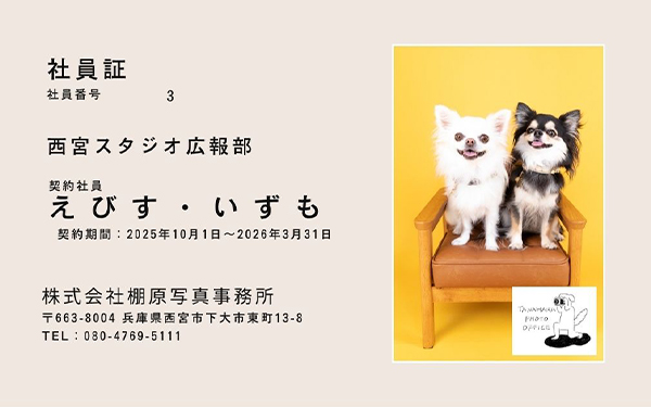 PR担当する犬たちは、棚原写真事務所で過去に撮影したことのある犬のなかから、社員犬32頭、アルバイト犬69頭の計101匹が選出され広報部として活動。全社員に社員証が発行されたほか、SNSでの西宮スタジオPR投稿、犬友への口コミ・紹介活動、名刺を持参してオフ会でのPR活動、Web上での社員犬ミーティングの参加、愛犬と楽しむ企画のアイデア出し、新スタジオの宣材モデル担当に加えて、毎年同じ日に撮影する記念企画の「つみフォト」での試験モデル協力など、精力的に活動しています。