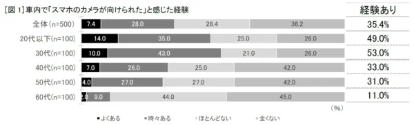 スマートフォンは生活に欠かせないインフラである一方、その使い方が周囲に不安や誤解を与えてしまうことがあります。ソフトバンクが実施した調査によると、車内で他人のスマホのカメラが自分に向いていると感じた経験がある人は35.4%、「撮られているかもしれない」と不安・不快感を覚えた人は28.0%と、約4人に1人が不安を経験しています。