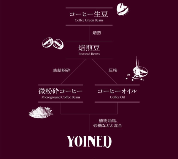 YOINEDは、「コーヒー豆の香りや味をすべて味わってみたい」という研究者の興味から着想を得て、20年以上の時をかけて誕生した“食べるコーヒー”です。コーヒーを飲んだ後に感じる「余韻」に由来し、コーヒー豆を丸ごと粉砕してコーヒーオイルと油脂でコーティングする日本初※1の独自製法で開発されました。