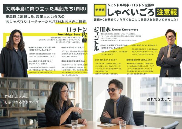 パーソナリティーを務めるジェントル川本さんとロットン佐藤さんは、イベント・広報・広告戦略などを手がけてきたそれぞれの経験を背景に、地域に関わるなかで感じた悩みや思考のプロセスを率直な言葉で共有します。
