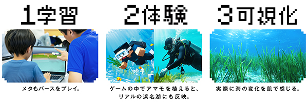 さらに、植えられたアマモの量に応じて浜名湖の生態系が豊かになっていく仕組みも備わっています。それにより、ゲームを通じて「脱炭素×生物多様性」のシミュレーションを体験できます。ブルーカーボンの仕組みを、遊びながら学べる教育環境プログラムです。