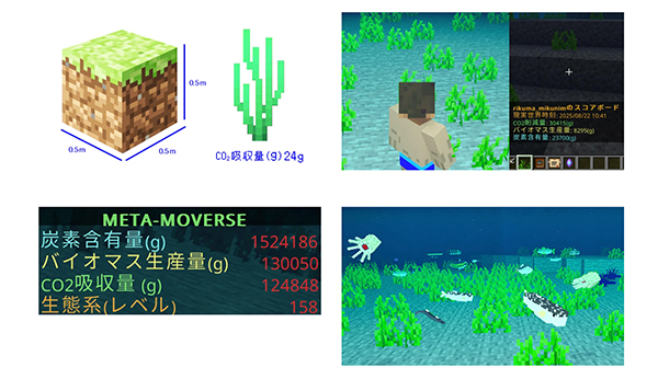 メタもバースは、ECDと慶応SDM未来共創イノベーション研究室が独自に開発したゲームコンテンツ。リモートセンシングと水中ドローンを利用して計測した浜名湖の3D点群データをもとに海の地図を、教育版マインクラフトの専用ワールドに再現しました。参加者がゲーム内で海の浅瀬に生える海藻であるアマモを植えると、それに比例してCO₂の吸収量が可視化されます。このCO₂の吸収量は実際の浜名湖産アマモの炭素収支を基に算出されているといいます。