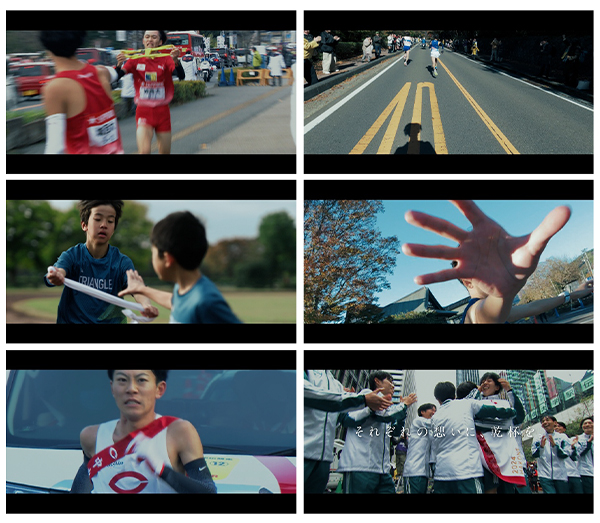 映像では、大会当日にたすきが見る、箱根路の景色がリアルに表現されました。たすきの受け渡しを待ちわびて⼿を伸ばす第2 ⾛者の姿や前を⾛るライバルたちの背中、声援を送る沿道の⼈びとなど⼤会中にたすき視点からの情景が描かれています。