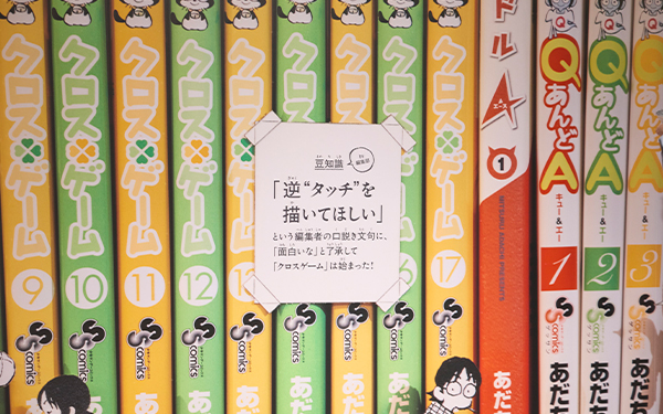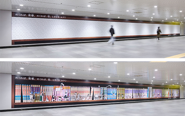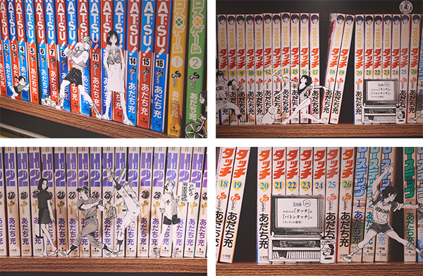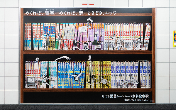 そして、カードがすべてピールオフされると、55年間で発売されたあだち充作品198冊が並ぶ巨大な本棚が出現。これまでの作品の背表紙だけではなく、作品内で描かれたキャラクターたちも前面に配置されました。まるで、本棚を背景にキャラクターたちがその場にいるようなビジュアルに仕上がっています。