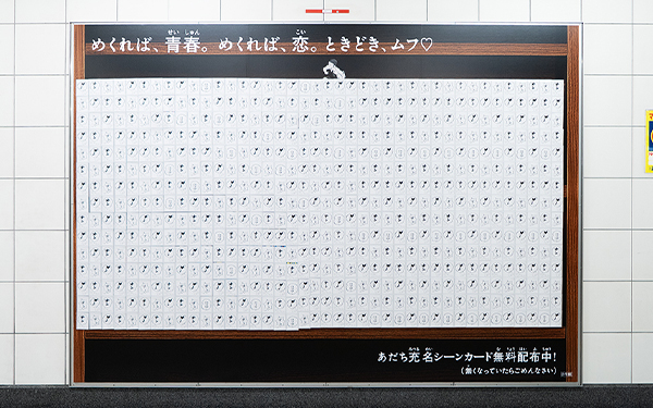 ピールオフできるカードの袋には、あだち充作品に多数描かれている犬のキャラクターの「パンチ」の鳴き声の吹き出しを複数パターン配置。ところどころにあだち漫画の特徴的な擬音の「ムフ♡」の吹き出しも見られます。袋には漫画の試し読みができる限定のカードが封入され、渋谷と有楽町で合計6,000枚近くのカードが配布されました。