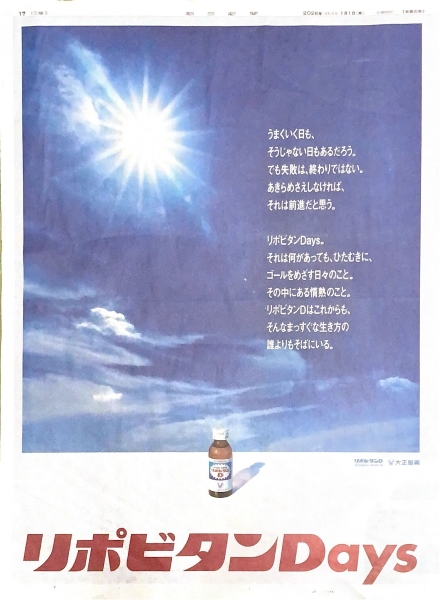 「ファイトイッパーツ!」を合言葉に、昭和・平成・令和と人びとの「活力」を支えてきたリポビタンD。2026年1月1日(水)から始動した新たなブランドプロモーション「リポビタンDays」の第1弾として、晴れやかな空をモチーフにした新聞広告を掲出。また、RADWIMPSの代表曲「君と羊と青」を起用したTV CMもオンエア中です。同社は毎日新聞・朝日新聞・読売新聞に同様の広告を展開しました。