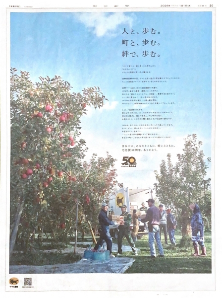 宅急便50周年を訴求。今よりも配送に時間がかかった時代から、宅急便の黎明期・1974年からともに歩んできたというりんご生産者グループとヤマト運輸社員の荷積みの風景を描きました。そこにあるエピソードは、これまで大切にしてきた企業精神の原点として心に響きます。周年だからこそ、初心を忘れずに前に進もうという想いが伝わってきます。ヤマト運輸は5紙すべてで同一広告を展開しました。