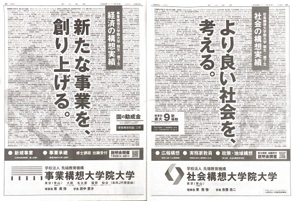 学部組織をもたない「大学院大学」という形態の総合専門職大学院にあたる社会構想大学院大学・事業構想大学院大学が見開きで紙面をジャック。それぞれの大学の実績企業名を背景に散りばめながら、干支の馬が左右に躍動感あふれるシルエットで添えられています。詳細をじっくり読まれることも、おおまかな印象を伝えることも両立させているレイアウトです。この新春広告は日経新聞・朝日新聞・読売新聞で展開されました。