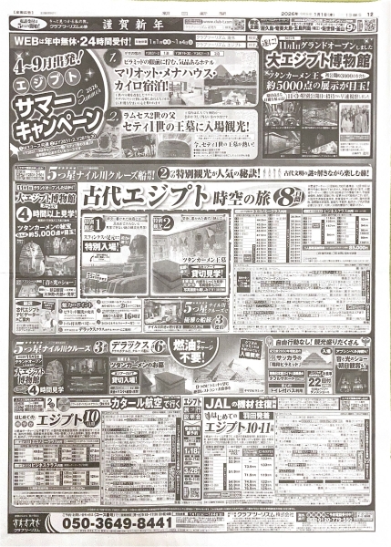 新聞広告といえば……フルパッケージの海外旅行ツアーのキャンペーン広告。2026年のクラブツーリズムは、エジプトツアーを大プッシュ。安・近・短の海外旅行先は、すでにフリープランの旅で訪問済みという中高年層をターゲットとしているのでしょうか。朝日新聞・読売新聞に新春広告を出稿した同社。しかしそれぞれの掲載内容とボリュームは異なっています。