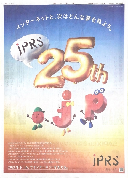 ドメイン名の登録管理業務とドメインネームシステムの運用事業者である日本レジストリサービス。設立25周年にあたる節目に新聞広告を掲出しました。インターネットによる世界の大きな変化を振り返りながら、今後も暮らしを豊かにする便利さを追求する姿勢を表明。ワクワクする未来へ向けた想いが「.jp」を表した公式キャラクターのドットン、ジェイミー、ピースケが大きくジャンプするイラストからも伝わります。この新春広告は日経新聞・朝日新聞の2紙で展開されました。