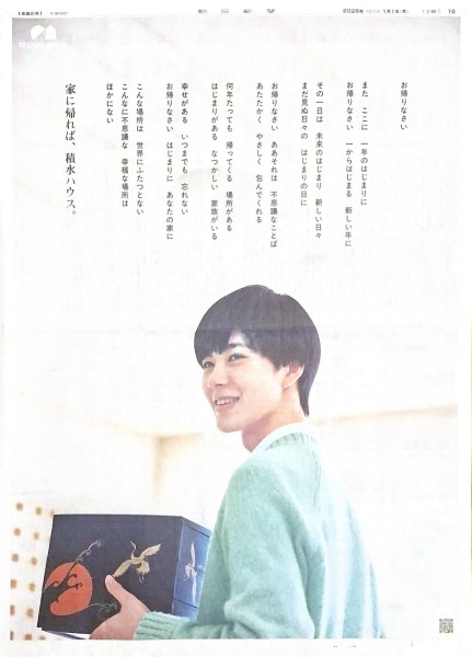年末年始の帰省や家族とともに過ごす場所としての「家」について、「お帰りなさい」という言葉をキーワードに存在価値をやさしい言葉で表現しています。おせちの重箱を掲げて振り返る人物――視線の先にいる大切な誰かをイメージしやすいビジュアルも効いています。同社によると「ご家族の幸せな暮らしと住まいを支えてゆくことを約束する企業広告」だといいます。積水ハウスは5紙すべてで同一広告を展開しました。