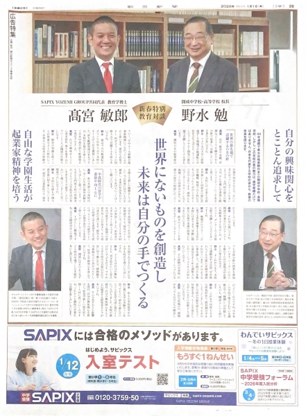 最難関中学・高校受験を目指す首都圏の進学教室といえば、SAPIX。中学受験の直前期にあたるお正月に、例年新聞広告を掲出しているという同社。朝日新聞では、開成中学校・高等学校の校長、野水勉さんとSAPIX YOZEMI GROUP共同代表で教育学博士の高宮敏郎さんの対談を公開しました。