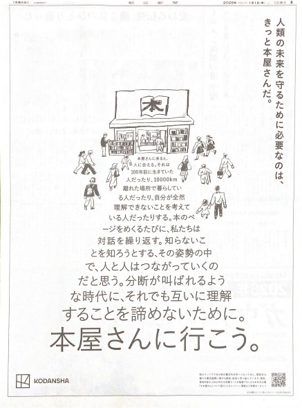 あえて自社の出版物ではなく「本屋さんに行こう。」と、その大切な販路にあたる書店を大きく掲げた講談社。本屋さんに集う人びとのイラストから、まっすぐに紡がれるメッセージには、書店の存在意義を訴えるメッセージが。書籍や出版物が人類の未来を担うと訴求すると同時に、「分断が叫ばれるような時代に、それでも互いに理解することを諦めないために」というメッセージを伝えました。右下には書店振興キャンペーンへの動線が用意されました。こちらは、日経新聞・朝日新聞・読売新聞・毎日新聞の4紙で展開。