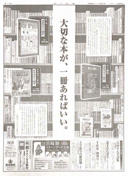 広辞苑や国内外の名著を収めた「岩波文庫」や「岩波新書」などの叢書で知られる出版社・岩波書店は、児童文学をピックアップ。刊行作品から5作品をピックアップすると同時に宮崎駿の書籍『本へのとびら』(岩波新書)を引用した広告を展開しました。