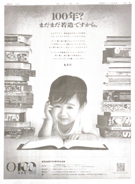 2026年8月8日(土)に創業100周年を迎える集英社。マンガ、文芸、ファッションをめぐる出版物の「版元」であり、デジタル・版権・イベント・物販などへも事業を拡大。その100年に渡る歴史を振り返りながら「まだまだ若造ですから。」と、未来への可能性をアピールしました。集英社は5紙に全面広告を出稿しており、日経新聞・朝日新聞・毎日新聞は同一ビジュアルです。読売新聞と産経新聞の広告では、自社のご長寿マンガIPキャラクターが登場しました。