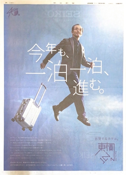 2026年1月に創業40周年を迎えるという東横INN。周年記念CMで「東横INN40年生」を演じる俳優の古舘寛治さんを起用して、40年間さまざまな人生のシーンで泊まった日の思いや変化を振り返るストーリーを展開しました。2月に「東横INN高知」がオープンすると、全47都道府県での出店を達成するといいます。東横INNは日経新聞・朝日新聞・読売新聞で同一広告を展開しました。