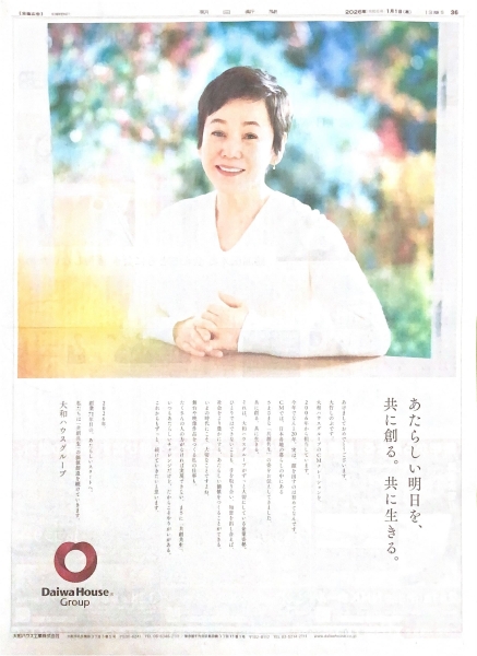 2006年から長くCMナレーションを担当してきた、大竹しのぶさんが初めて広告へ登場。これまで大竹さんはナレーションで日本各地の暮らしにある「共創共生」のさまざまな形を伝えてきたといいます。新春広告でも柔らかく「自分たちの暮らしに必要なもの」と語りかけています。2025年に創業70周年の節目を迎え、71年目の新たなスタートにふさわしい、オーセンティックな企業広告です。大和ハウスグループは5紙すべてで同一広告を展開しました。