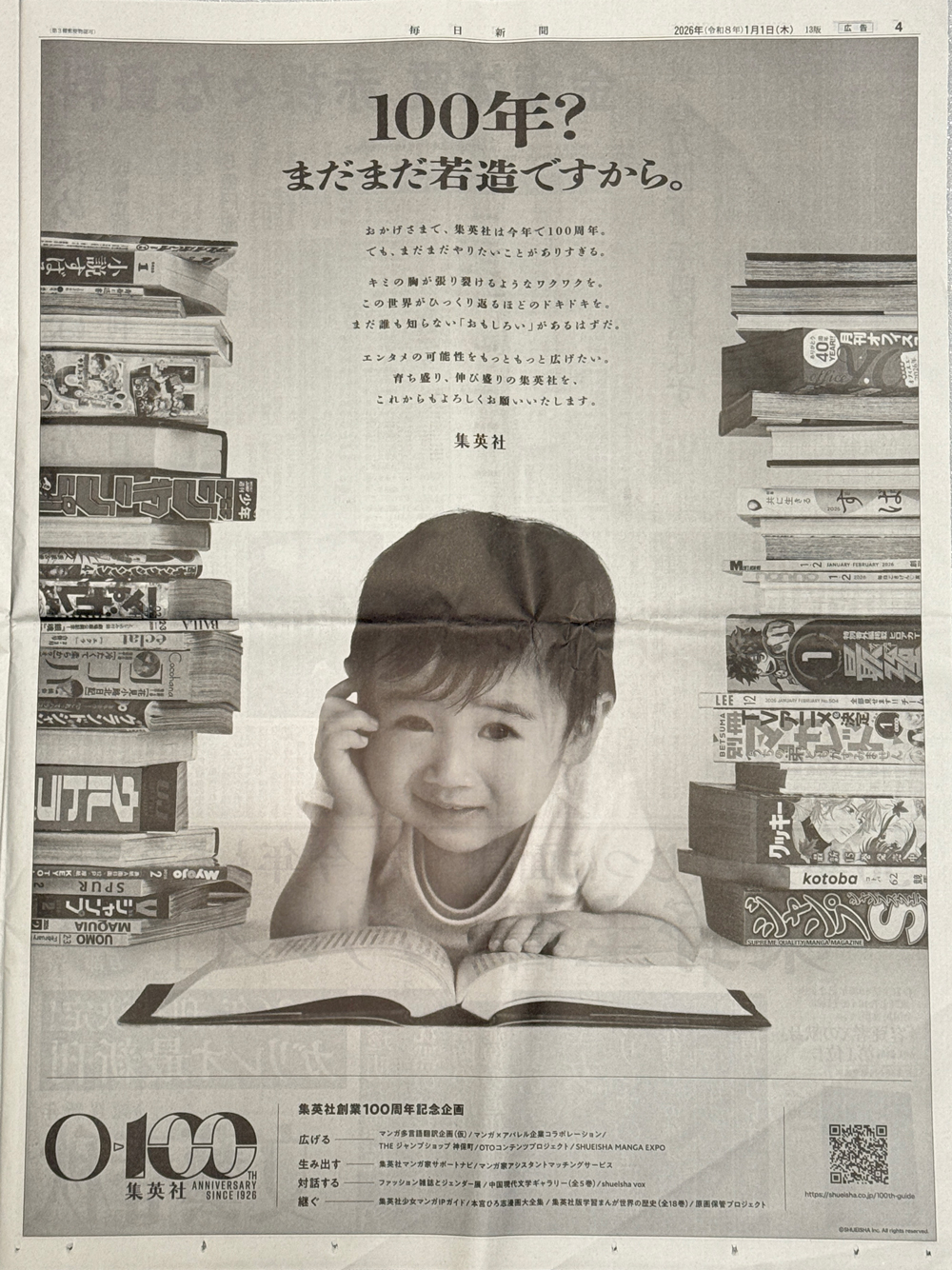 2026年8月8日(土)に創業100周年を迎える集英社。マンガ、文芸、ファッションをめぐる出版物の「版元」であり、デジタル・版権・イベント・物販などへも事業を拡大。その100年に渡る歴史を振り返りながら「まだまだ若造ですから。」と、未来への可能性をアピールしました。集英社は5紙に全面広告を出稿。日経新聞・朝日新聞・毎日新聞は同一ビジュアル。読売新聞と産経新聞の広告では、自社のご長寿マンガIPキャラクターが登場しました。