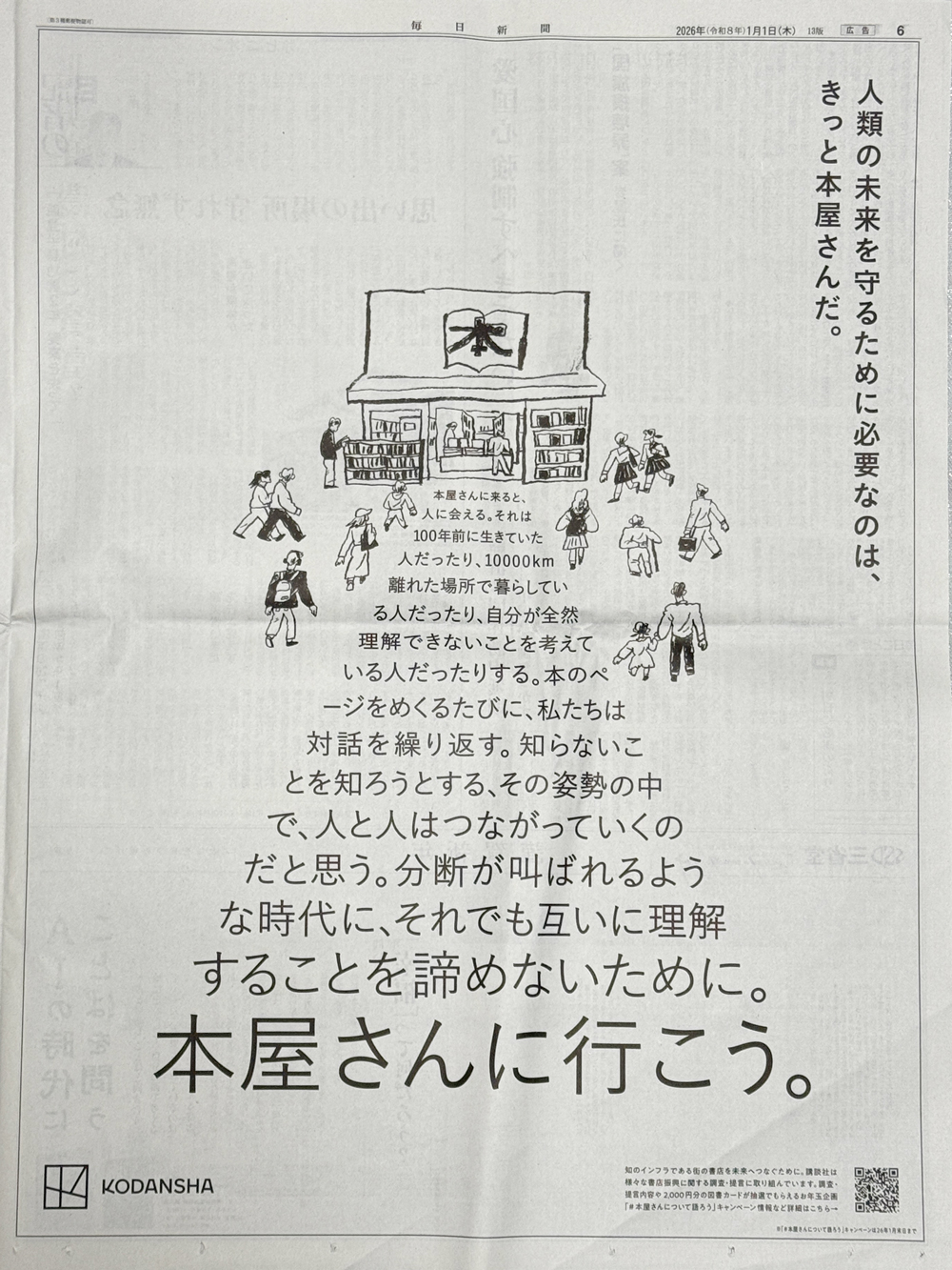 あえて自社の出版物ではなく「本屋さんに行こう。」と、その大切な販路にあたる書店を大きく掲げた講談社。本屋さんに集う人びとのイラストから、まっすぐに紡がれるメッセージには、書店の存在意義を訴えるメッセージが。書籍や出版物が人類の未来を担うと訴求すると同時に、「分断が叫ばれるような時代に、それでも互いに理解することを諦めないために」というメッセージを伝えました。右下に書店振興キャンペーンへの動線が用意されました。日経新聞・朝日新聞・読売新聞・毎日新聞の4紙で展開。