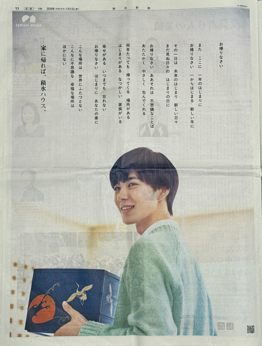 年末年始の帰省や家族とともに過ごす場所としての「家」について、「お帰りなさい」という言葉をキーワードに存在価値をやさしい言葉で表現しています。おせちの重箱を掲げて振り返る人物――視線の先にいる大切な誰かをイメージしやすいビジュアルも効いています。同社によると「ご家族の幸せな暮らしと住まいを支えてゆくことを約束する企業広告」だといいます。積水ハウスは5紙すべてで同一広告を展開しました。
