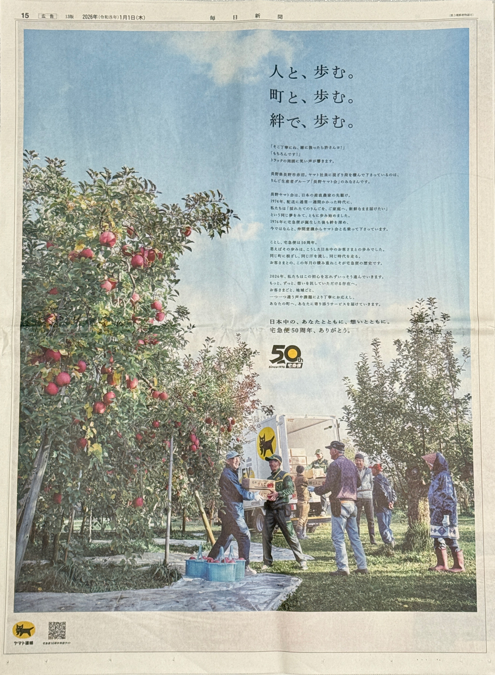 宅急便50周年を訴求。今よりも配送に時間がかかった時代から、宅急便の黎明期・1974年からともに歩んできたというりんご生産者グループとヤマト運輸社員の荷積みの風景を描きました。そこにあるエピソードは、これまで大切にしてきた企業精神の原点として心に響きます。周年だからこそ、初心を忘れずに前に進もうという想いが伝わってきます。ヤマト運輸は5紙すべてで同一広告を展開しました。