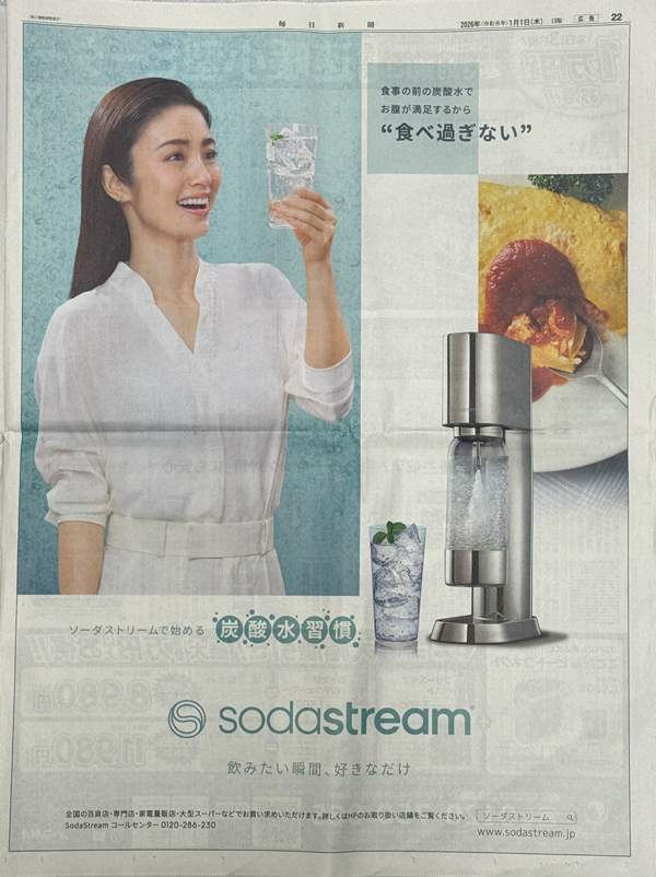 自宅で簡単に炭酸水を作れるソーダメーカーのソーダストリーム。食事前に炭酸水を作って飲むことで食べ過ぎを防いでくれるというメリットを提示して習慣化を訴求しています。お正月は食べ過ぎが気になる人も多いタイミングなので、新規ユーザー獲得への効果も期待できそうです。