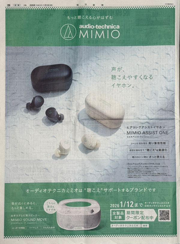 “聴こえ”をサポートするブランド、オーディオテクニカミミオのイヤホンとともに手元スピーカーも紹介。年末年始の帰省先で、両親や親戚に必要性を感じた子ども世代への訴求となりそうです。公式オンラインストアでのクーポンキャンペーンも伝え、販売促進へとつなげています。