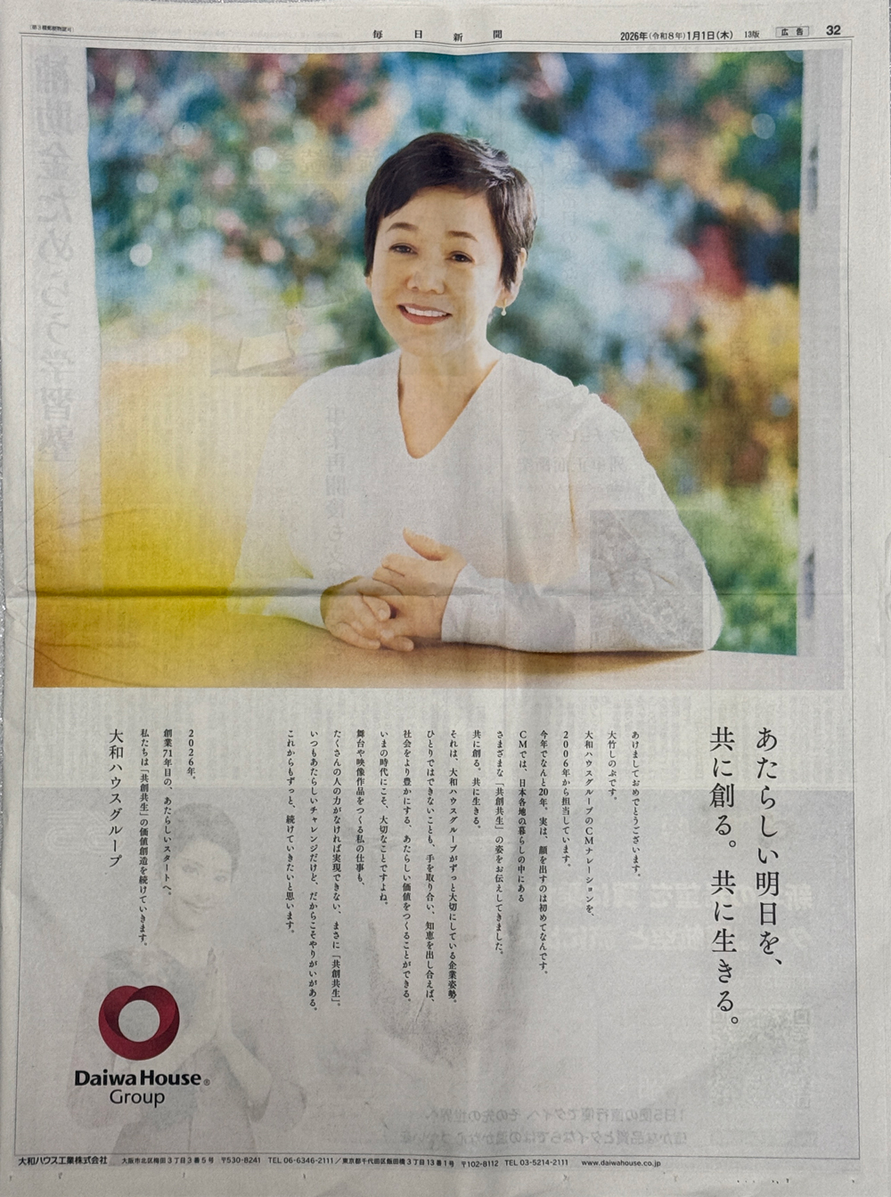2006年から長くCMナレーションを担当してきた、大竹しのぶさんが初めて広告へ登場。これまで大竹さんはナレーションで日本各地の暮らしにある「共創共生」のさまざまな形を伝えてきたといいます。新春広告でも柔らかく「自分たちの暮らしに必要なもの」と語りかけています。2025年に創業70周年の節目を迎え、71年目の新たなスタートにふさわしい、オーセンティックな企業広告です。大和ハウスグループは5紙すべてで同一広告を展開しました。