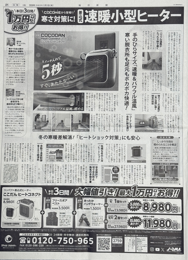 寒さの厳しくなるお正月シーズンの需要を見込んでか、ショップジャパンの新春広告は暖房器具を大々的に取り上げました。寒暖差によるヒートショック対策の大切さと予防が可能な商品説明、そして大幅値引きの期間限定キャンペーンで販売促進につなげています。