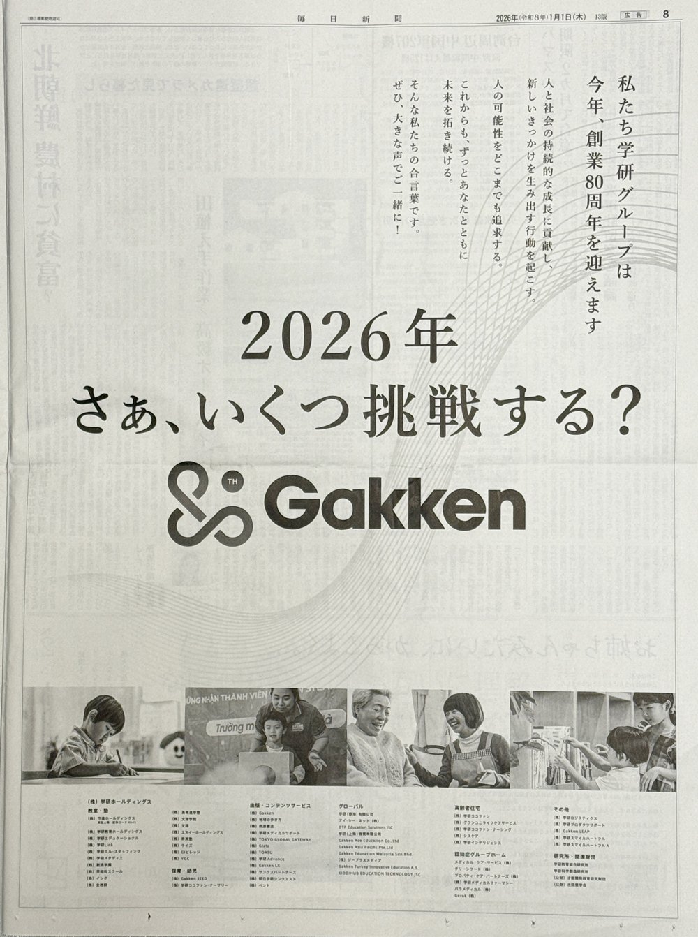 創業80周年を迎えるGakken。「2026年 さぁ、いくつ挑戦する?」を合言葉にさまざまな事業を展開していくことを、社名ロゴと大きなキャッチコピーで中央に配置。高らかに宣言するようなメッセージが伝わってくる紙面構成となりました。