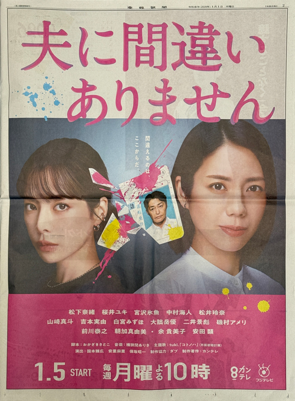 1月5日(月)から放送開始のドラマ「夫に間違いありません」の告知広告。主演の松下奈緒さんが、家族を守るため犯罪に巻き込まれていく母親を演じます。「間違えるのは、ここからだ。」のキャッチコピーが控えめながらも、刻まれた免許証など不穏な幕開けを感じさせます。