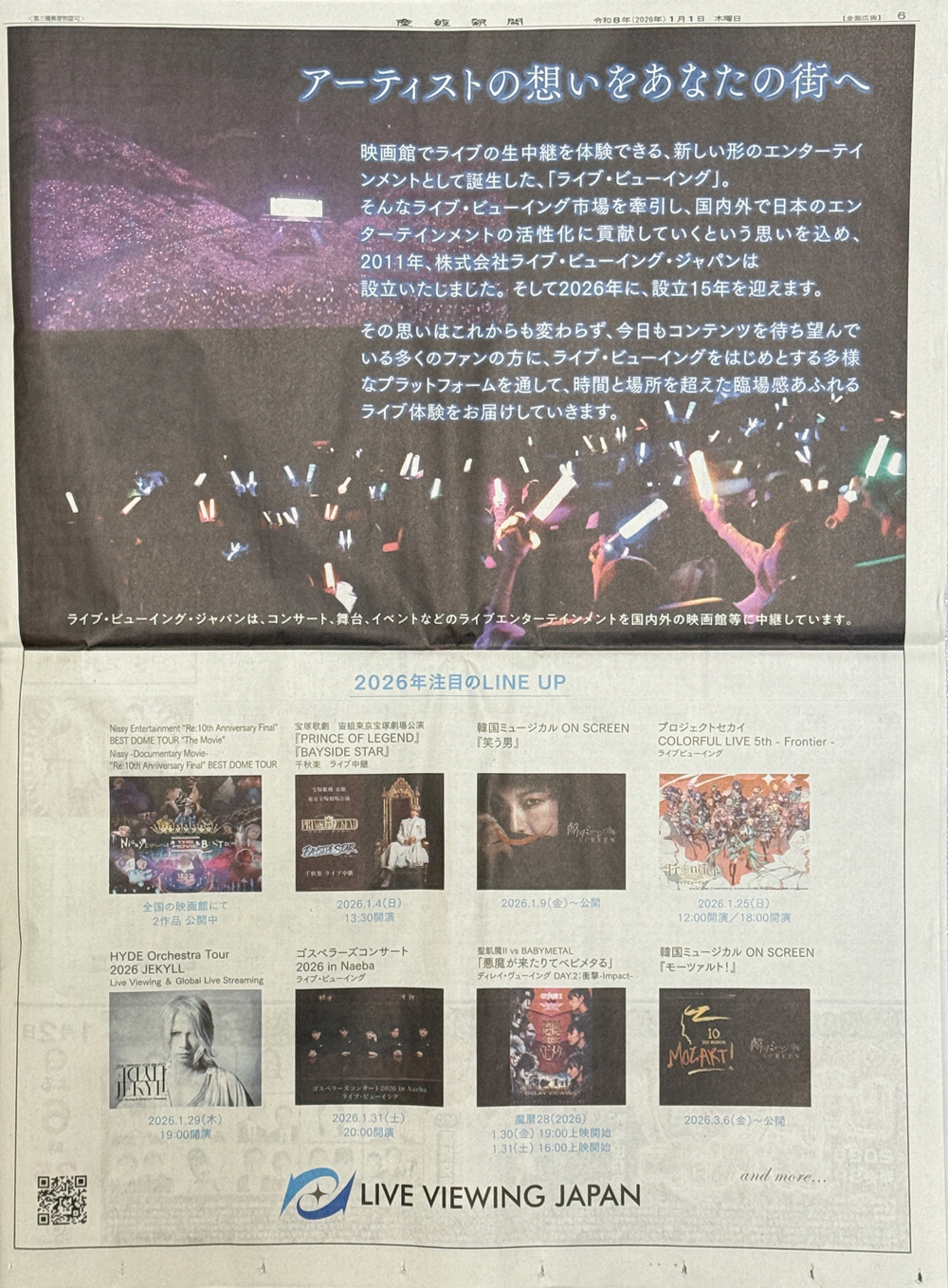 ライブ・ビューイング市場を牽引してきたという同社が設立15周年を迎えるにあたっての、あらためて決意表明。下段には2026年の注目のラインアップが並び、今後のライブ・ビューイングへの期待を高めています。