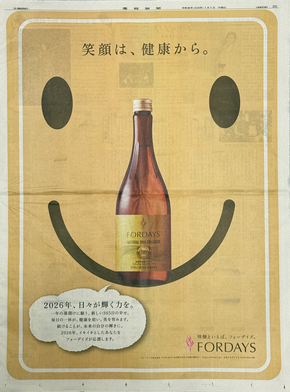 フォーデイズは、人の細胞のなかにある栄養素、核酸(DNA・RNA)・核タンパクの研究を続け、「強く健康な身体をつくる」ための製品を展開する企業です。新しい年に向けて、「核酸ドリンク ナチュラル DNコラーゲン」のボトル写真を中央に、笑顔を配置することで商品のイメージを訴求しました。