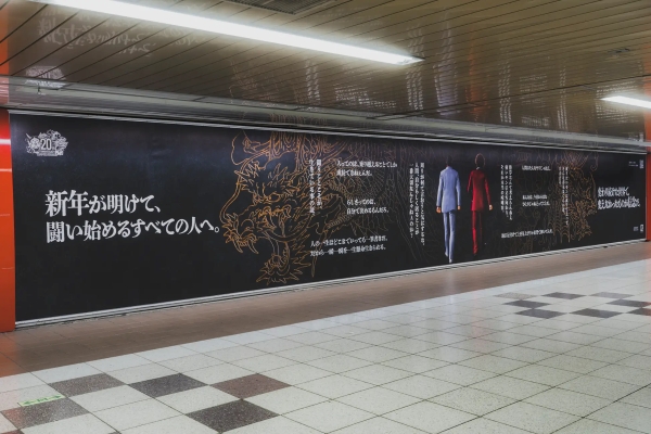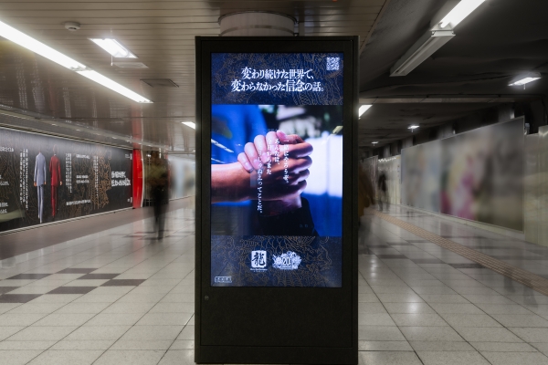 新宿・歌舞伎町をモデルにした架空の繁華街”神室町”を舞台に、男たちの生き様を描いたアクションアドベンチャーゲーム『龍が如く』(2005年/セガ)。その誕生から20年を経て、同作が掲げる“美学”や“信念”を力強く表現する大型広告が、新宿駅地下エリアに登場しました。