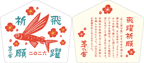 さらに、同店で商品を購入した人には、太宰府天満宮参道店限定デザインの「飛躍のあごステッカー」を配布。合格を連想させる五角形のステッカーは、飛躍祈願の文字やあご(飛び魚)、そして太宰府らしい梅をあしらった、明るく親しみやすいデザインが印象的です。
