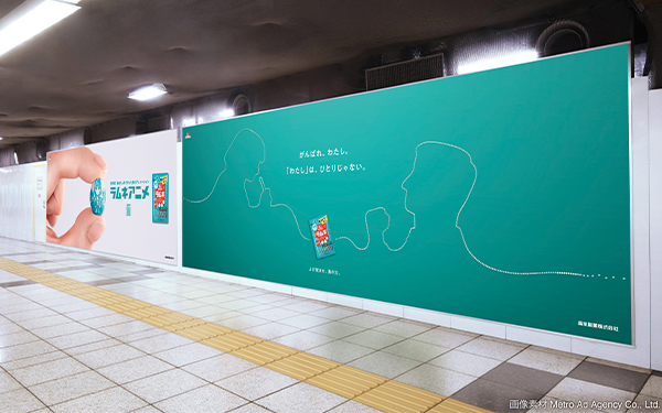 掲出されたOOHの“がんばれ、わたし。「わたし」は、ひとりじゃない。”のキャッチコピーやラムネを並べたシンプルなイラストは、受験生本人への応援のみならず支える人々も可視化するデザインとして、わかりやすく訴求する仕上がりです。