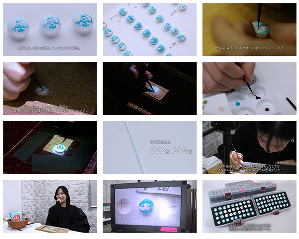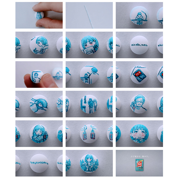 美術大学の学生5名が、森永ラムネ(大粒ラムネ)332粒の両面に食用インクを用いて手作業でイラストを描く姿をコマ撮りで撮影しました。手描きのラムネは、実に330時間をかけて完成させた大作です。