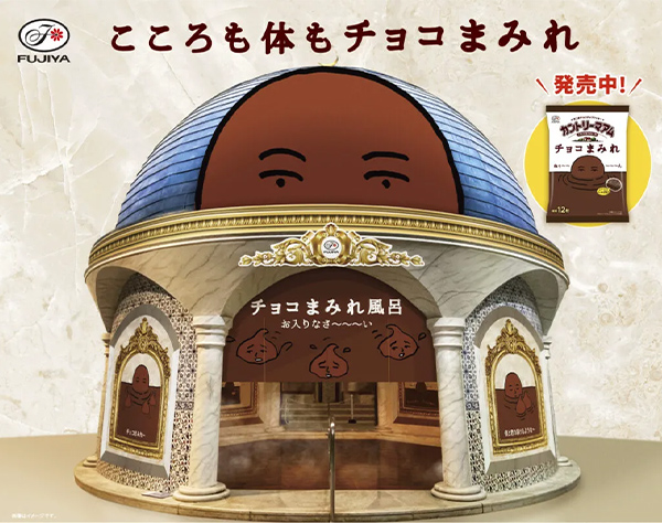 水着で遊べる温泉「ユネッサン」では、魅惑のチョコレートの香りが漂う「カントリーマアム チョコまみれ風呂」を実施。「お入りなさ〜〜〜い」というのれんがかかったドーム型の浴槽と、色と香りでチョコレートを再現した温泉は、まるで商品パッケージに描かれた「チョコ沼」に浸かっているよう。1日1〜2回、お風呂にチョコソースが投入されるイベントもあり、全身でチョコを浴びているかのような体験ができます。