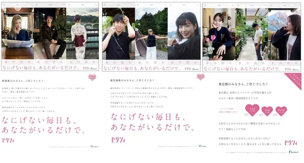 これらの調査でそれぞれ1位に輝いた東京都、鹿児島県、新潟県の3都県に、2025年1月27日(月)から2月2日(日)まで駅広告を掲出しました。掲出場所は東京メトロ新宿駅、JR鹿児島中央駅、JR新潟駅です。いずれの広告も、普段は意識しない、パートナーがいる日常の大切さに気付かせてくれる内容となっています。