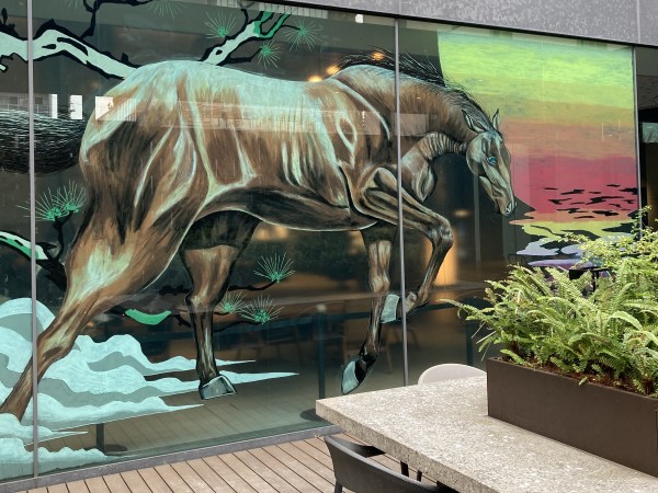東京ベイ潮見プリンスホテル開業5周年企画のキットパスウィンドウアートを手がけた佐藤周作氏は、独特のタッチで躍動感あふれる生き物の様子を描く「動物墨絵師」。佐藤氏は12月27日(土)・28日(日)の2日間にわたり、ホテルロビーにてウィンドウアートを制作しました。