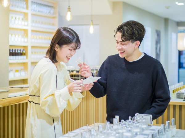 ギフトボックスには空のフレグランスボトルが入っており、贈る側はキャップカラーの選択やフレグランスネームの記入を通して思いを宿らせます。受け取った側は店舗へ持参し、アドバイザーとともに香りを調合して1本のボトルを完成させます。香りの最終決定を受け取る側にゆだねる構造は、フレグランスギフトが抱えやすい“好みの不確実性”へのアプローチのひとつです。