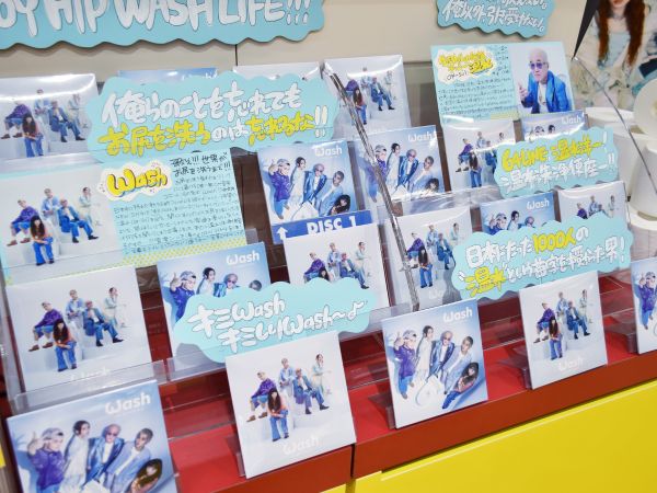 店内1階エントランスには特設ブースを設置。ミュージックビデオが流れるモニターや試聴機、温水(ON-SUI)本人による解説POP、そしてMV撮影で使用されたグッズなどを展示しています。これは、タワレコ渋谷が、新作音源などをPRする際に用いられる“ガチ手法”にあたりますが、Wash feat.温水(ON-SUI)のフィジカルリリースは行われていません。
