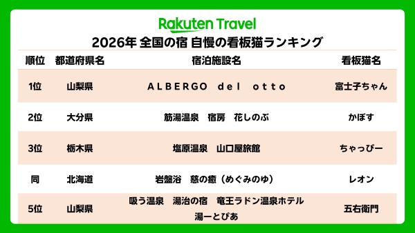 楽天グループ株式会社が運営する旅行予約サービス「楽天トラベル」は、全国の宿泊施設で親しまれる看板猫を対象にした「楽天トラベル 2026年 全国の宿 自慢の看板猫ランキング」を発表しました。楽天会員による投票をもとに順位を算出する、ユーザー参加型の取り組みです。