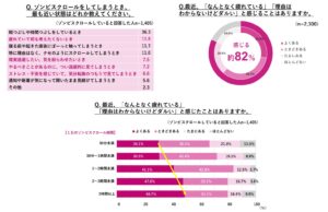 また、ゾンビスクロールを長時間行っている人ほど、最近なんとなく疲れている」「理由はわからないけれどダルい:と感じることがあるという割合が高くなっていることが判明。ゾンビスクロールの背景には、自覚しにくい”見えない疲れ”が関係していることが伺えます。