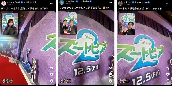 公開前日には前夜祭イベントが行われ、同アプリの公式アカウントを持つインフルエンサーが参加しました。会場の熱気をリアルタイムで投稿し「今、この瞬間」を共有することで、イベントの臨場感を伝え、公開直前の盛り上がりを後押しします。