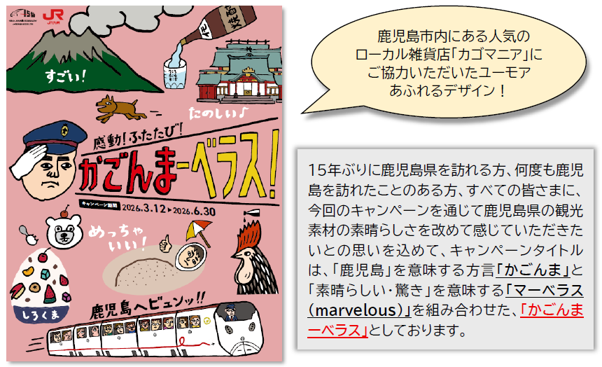 「鹿児島」を意味する方言「かごんま」と「素晴らしい・驚き」を意味する英語「マーベラス」を掛け合わせた造語「かごんまーベラス」をキャンペーンタイトルに掲げ、シュールな手書きイラストとあわせて鹿児島県の魅力を発信します。