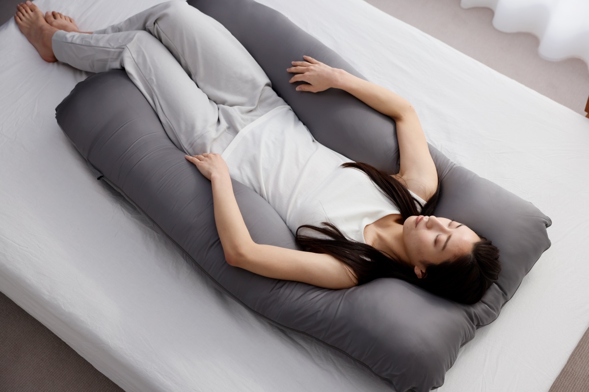 「ひとりひとりの“睡眠環境”に寄り添っていくこと」を使命に掲げる同社の抱き枕『ハグモッチ』の特徴は、身体をやさしく囲むフォルムです。全身を包み込む商品設計で、抱きしめられているかのような安心感を生み出し、リラックスできる姿勢をサポートします。