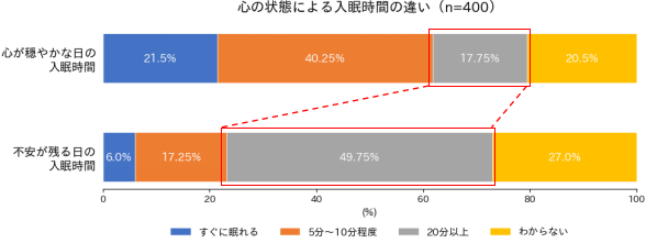 「入眠時間の違い」についての質問では、心穏やかな日は6割の人が10分以内に入眠する一方で、不安を感じる日は約半数の人が入眠に20分以上かかると回答。心理状態で入眠時間に約3倍差が出るという結果になりました。