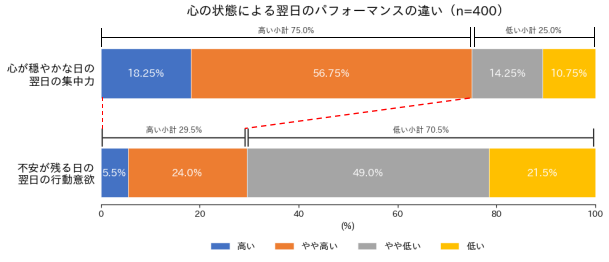 また、心の状態がもたらす翌日のパフォーマンスの違いの調査では、不安を感じながら朝を迎えた人の多くが「行動意欲が低下する」と回答。心理状況と睡眠の質が、翌日のパフォーマンスに大きく影響を及ぼすという声が多く集まりました。