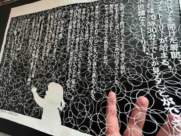また、広告内には切り絵で作成した二次元コードを配置し、「読み取るとラブストーリーが始まります」というコピーとともに掲出しています。読む体験から観る体験へと自然につなぎ、動画視聴を促す仕掛けです。